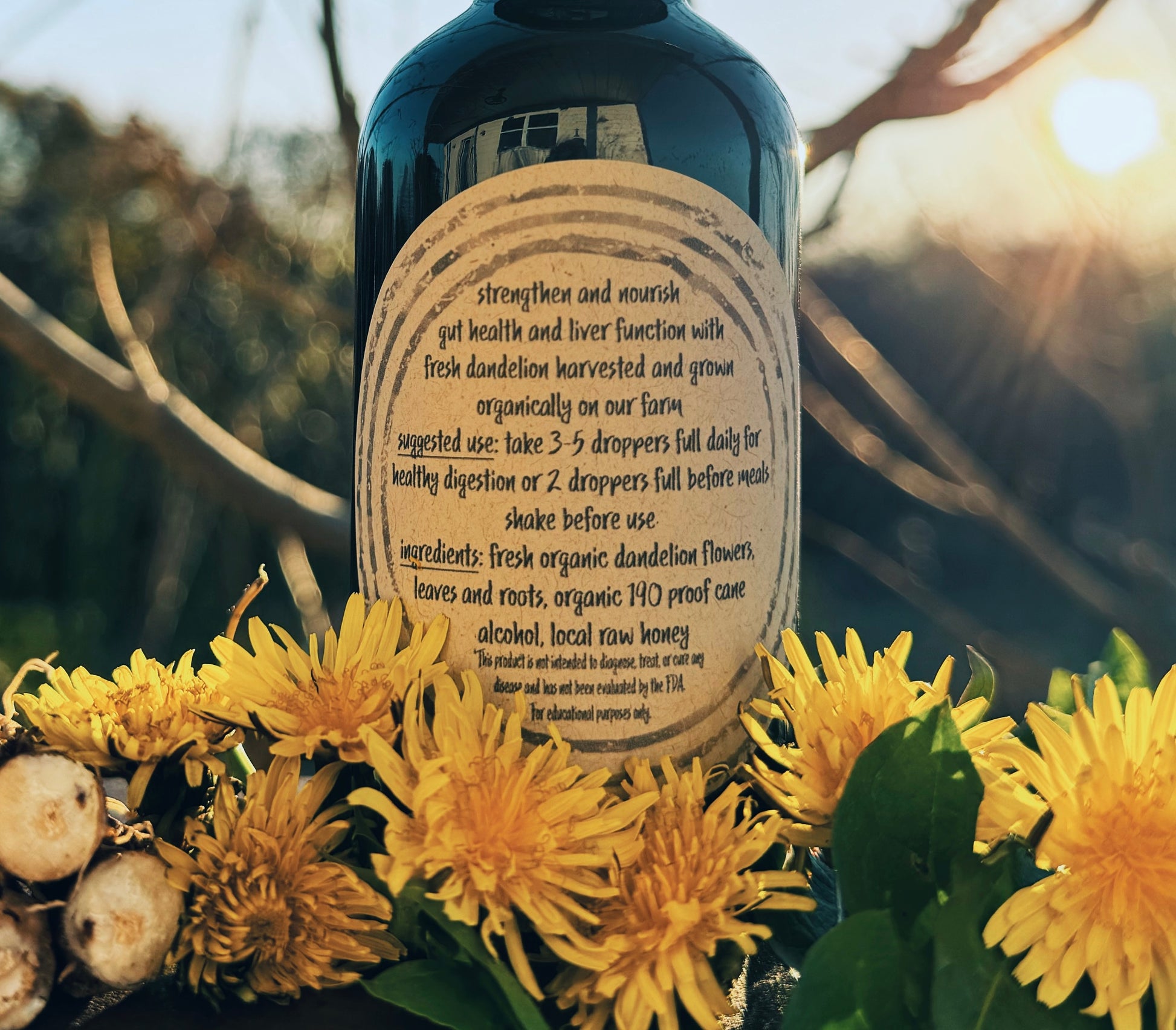 Strengthen and nourish gut health and liver function with fresh dandelion root, leaves and flowers harvested and grown organically on our farm•Crafted with organic 190 proof cane alcohol for 4-6 weeks using the energy of the sun and moon•Handmade in small batches with love and intention•