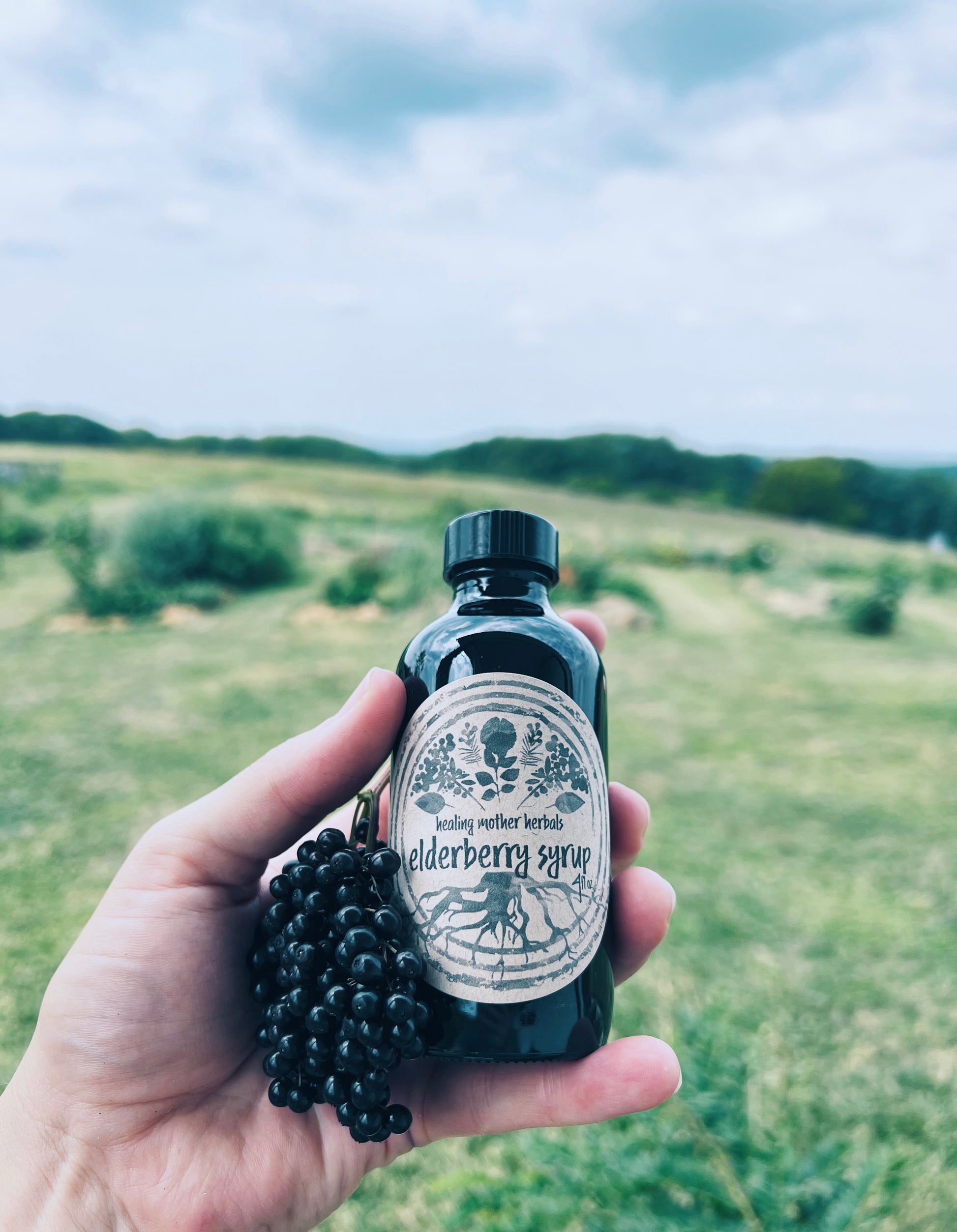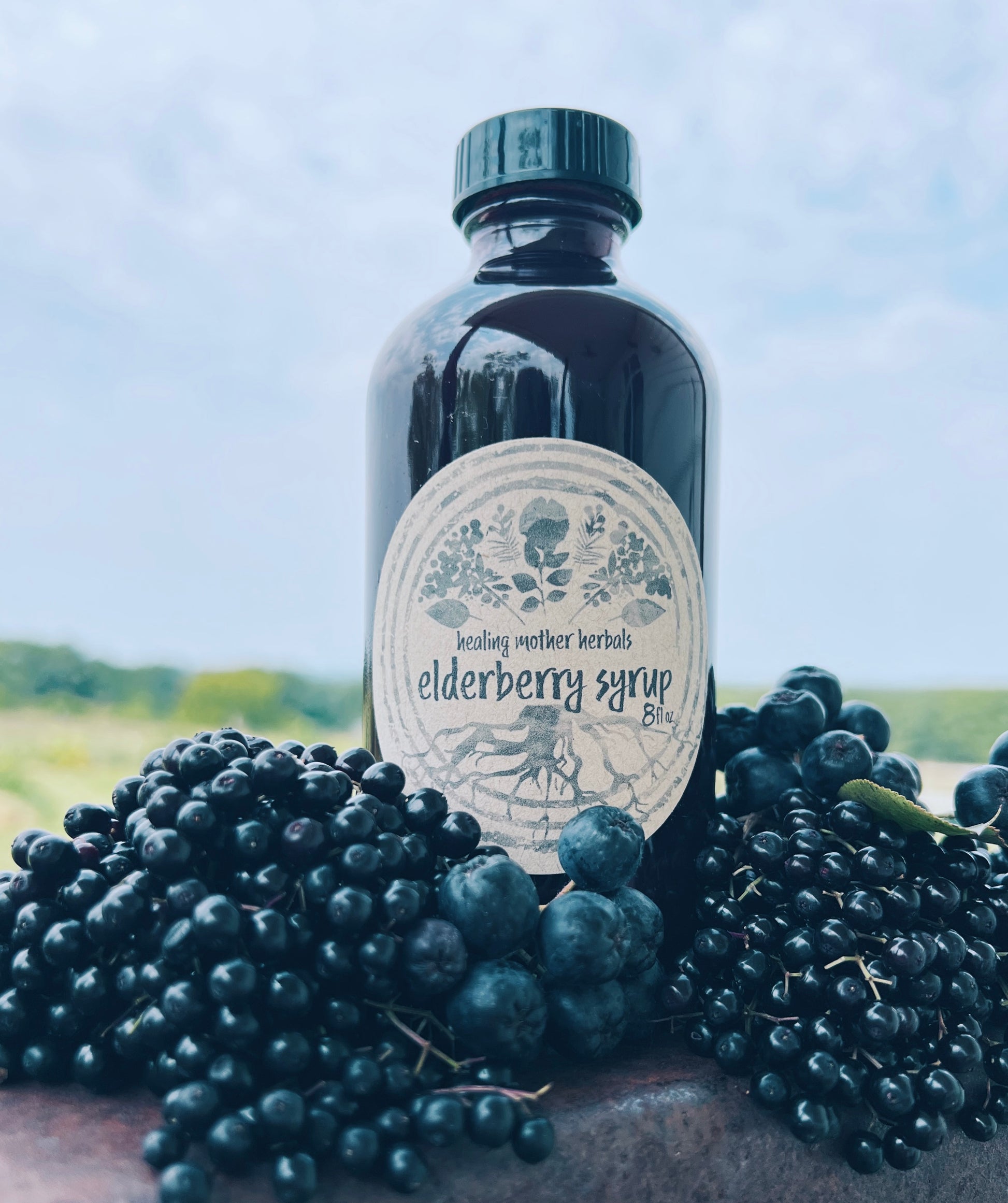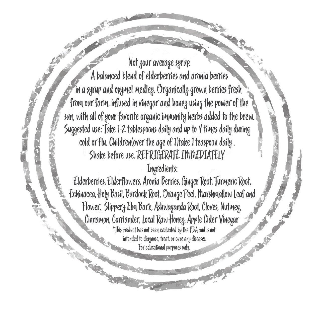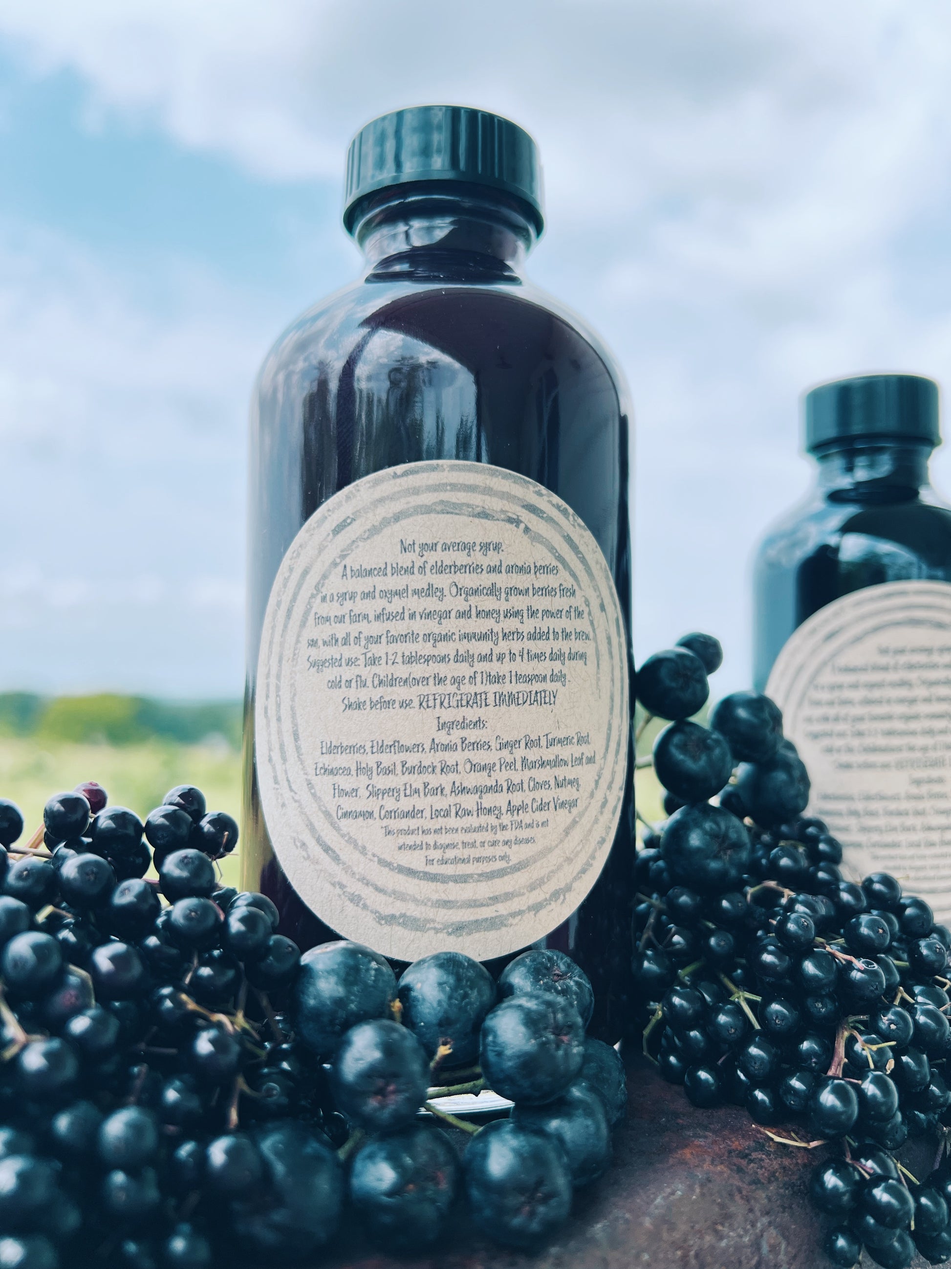 Elderberry and Aronia Berry Immunity Elixir•Not your average syrup•This syrup is made with fresh berries grown organically right on our farm•These immunity boosting berries are infused in vinegar and honey for several weeks and then added to an herb brew with all of the amazing essentials to keep you and your family healthy all year round•Gear up for cold and flu season in the healthiest way with our tangy and sweet Purple Syrup•