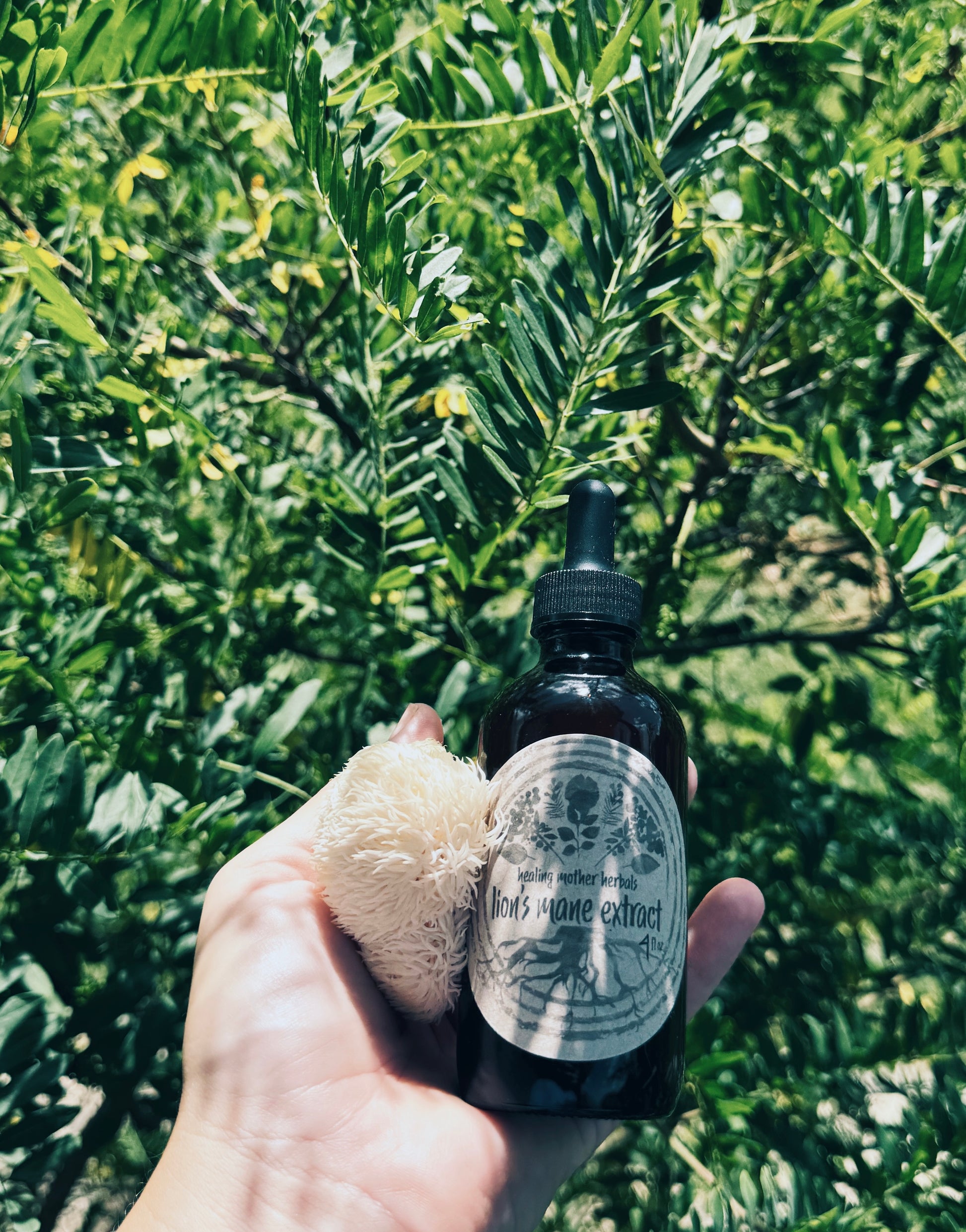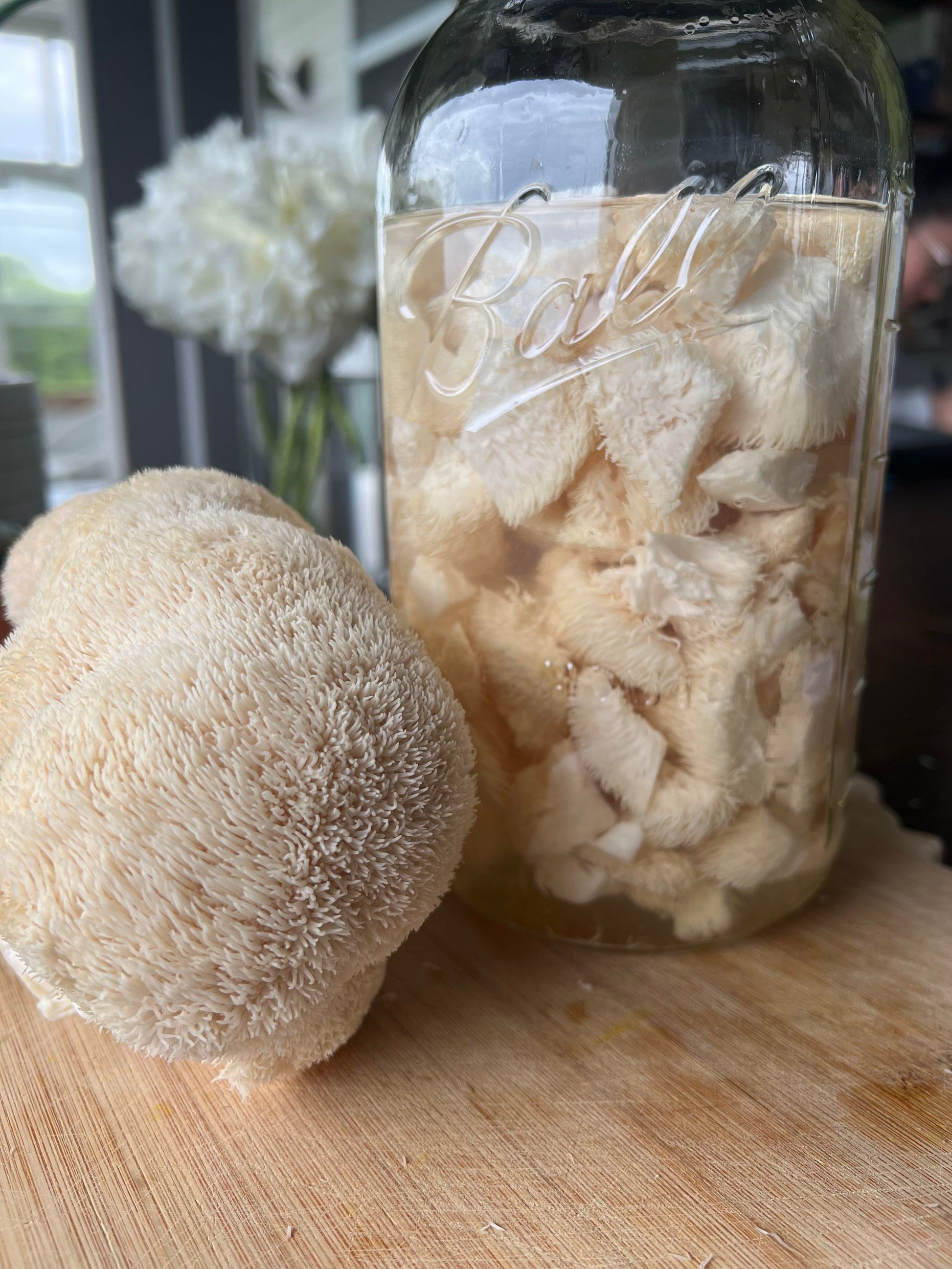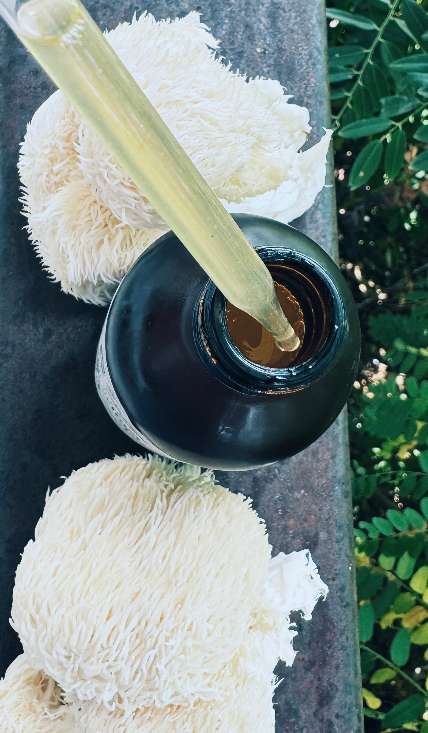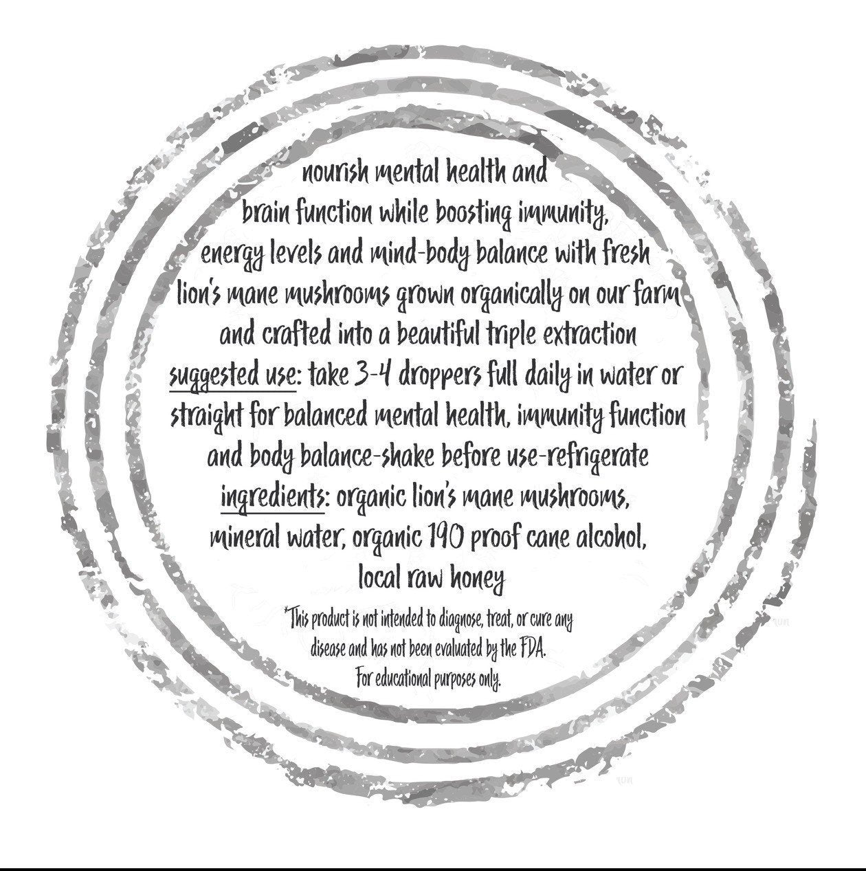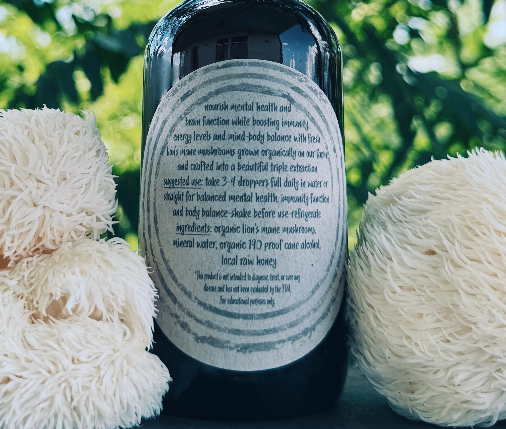 Fresh, organic lion’s mane mushrooms, mineral water, organic 190 proof cane alcohol and local raw honey•