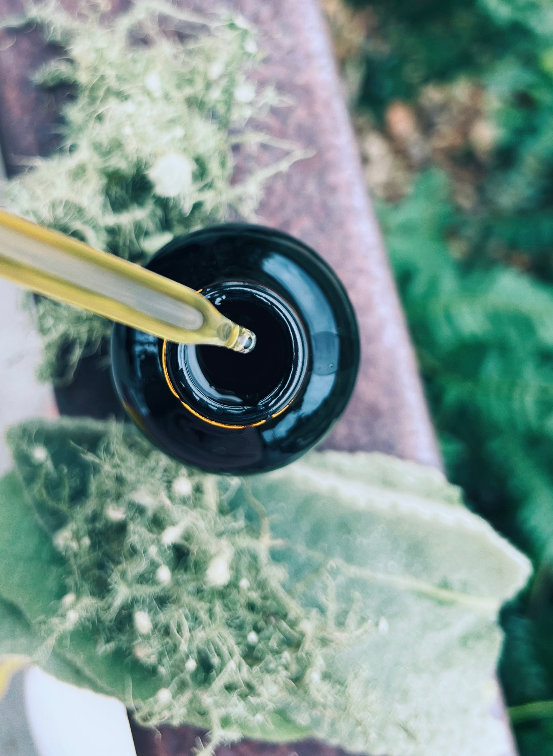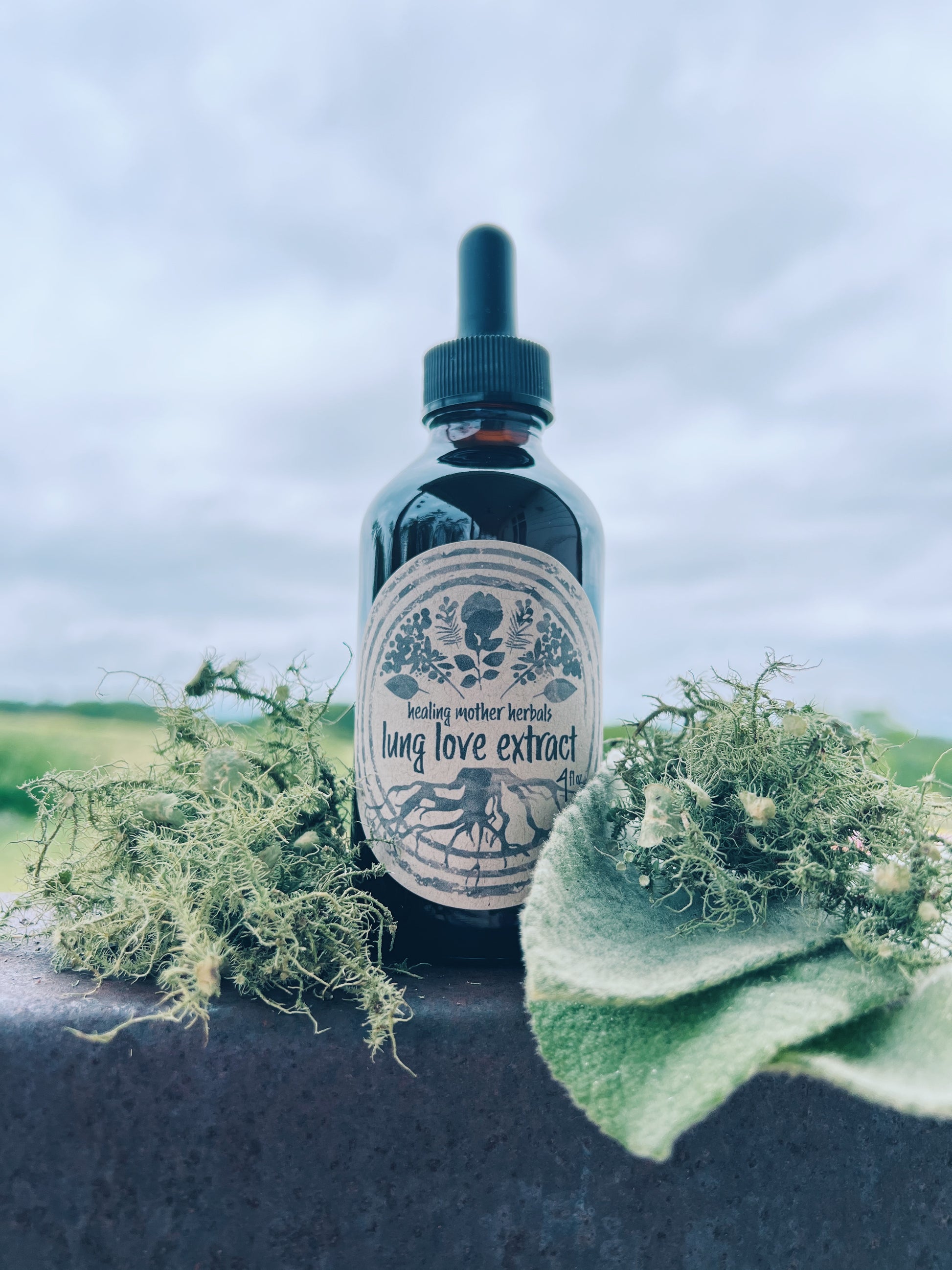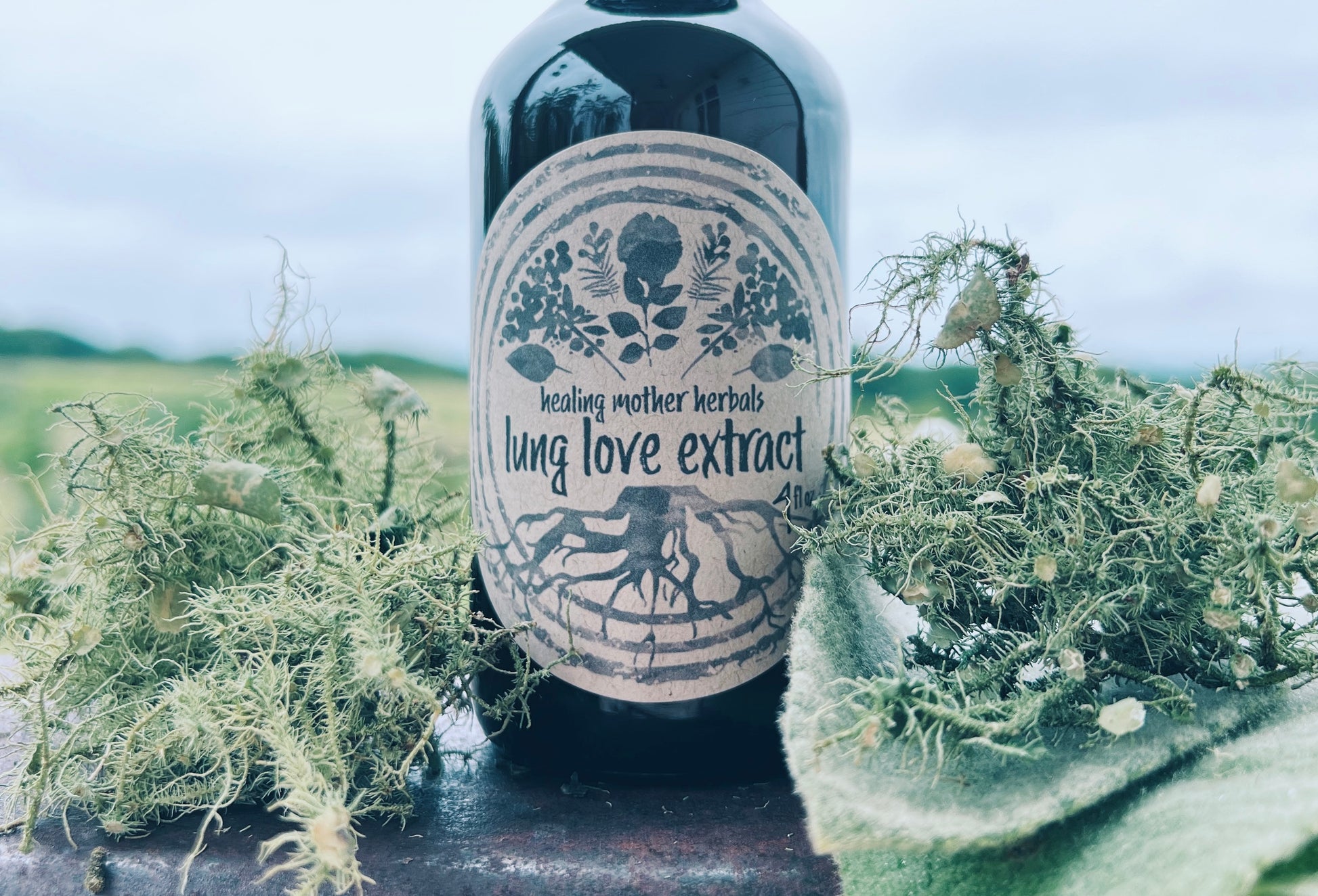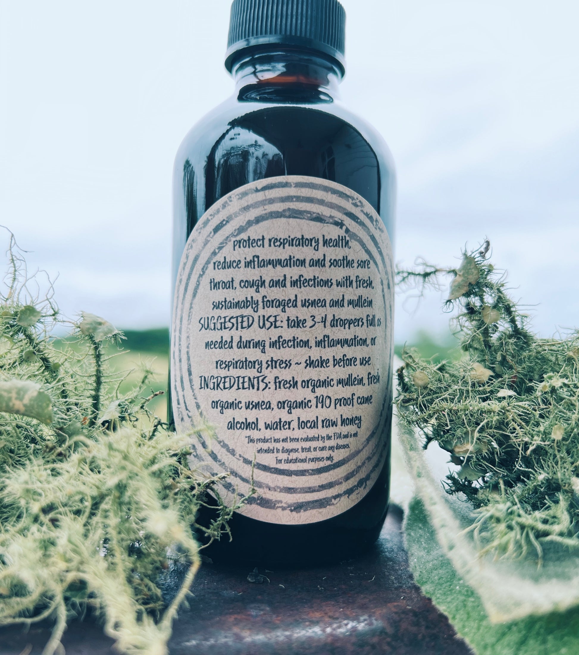 Mullein is a gentle friend that will ease and calm any lung irritation and help release mucous•Usnea holds strong as a well rounded respiratory protector, soothing heated conditions and soreness while drying up mucous•