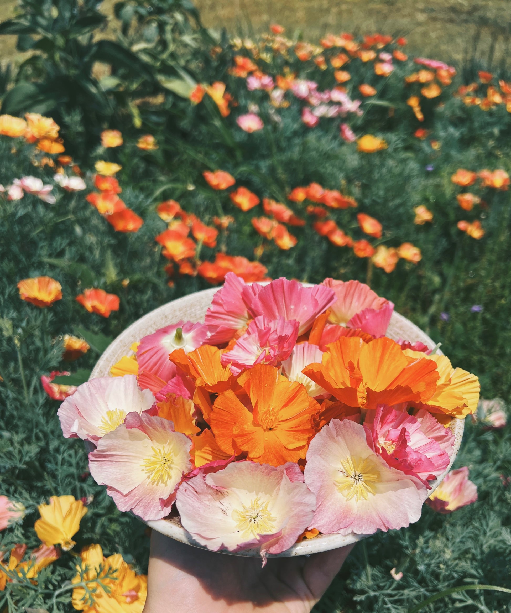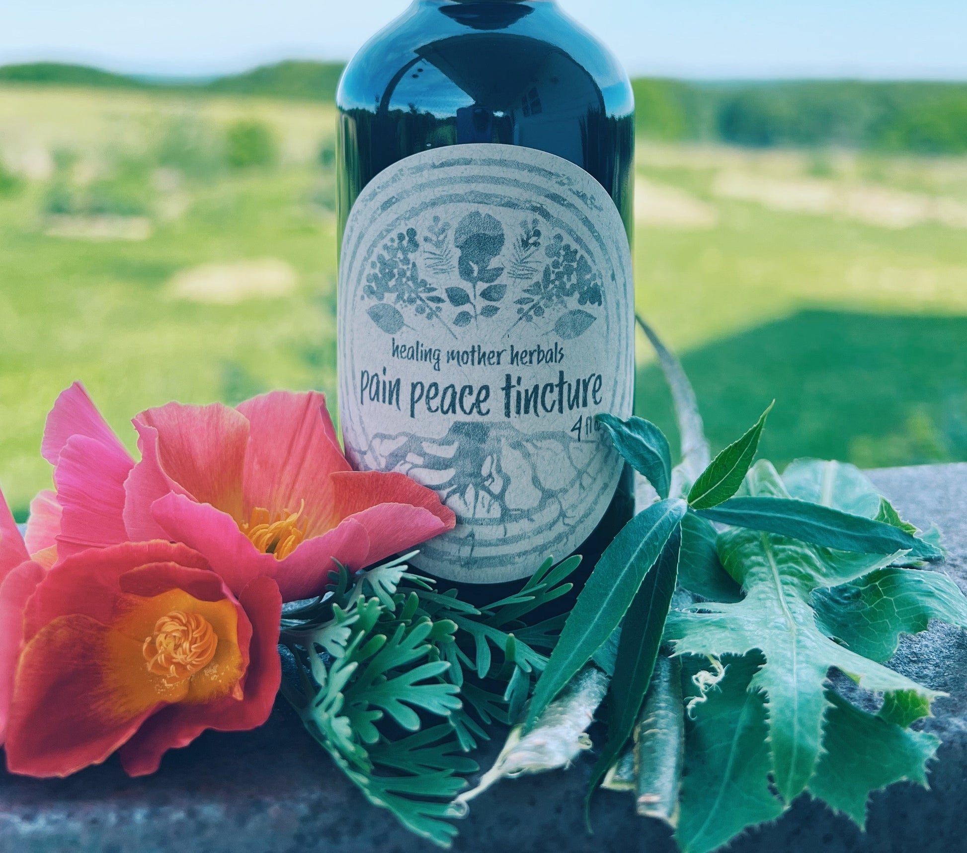 Ease and calm your aches and pains with fresh california poppy, willow bark, blue vervain and wild lettuce grown organically on our farm•
