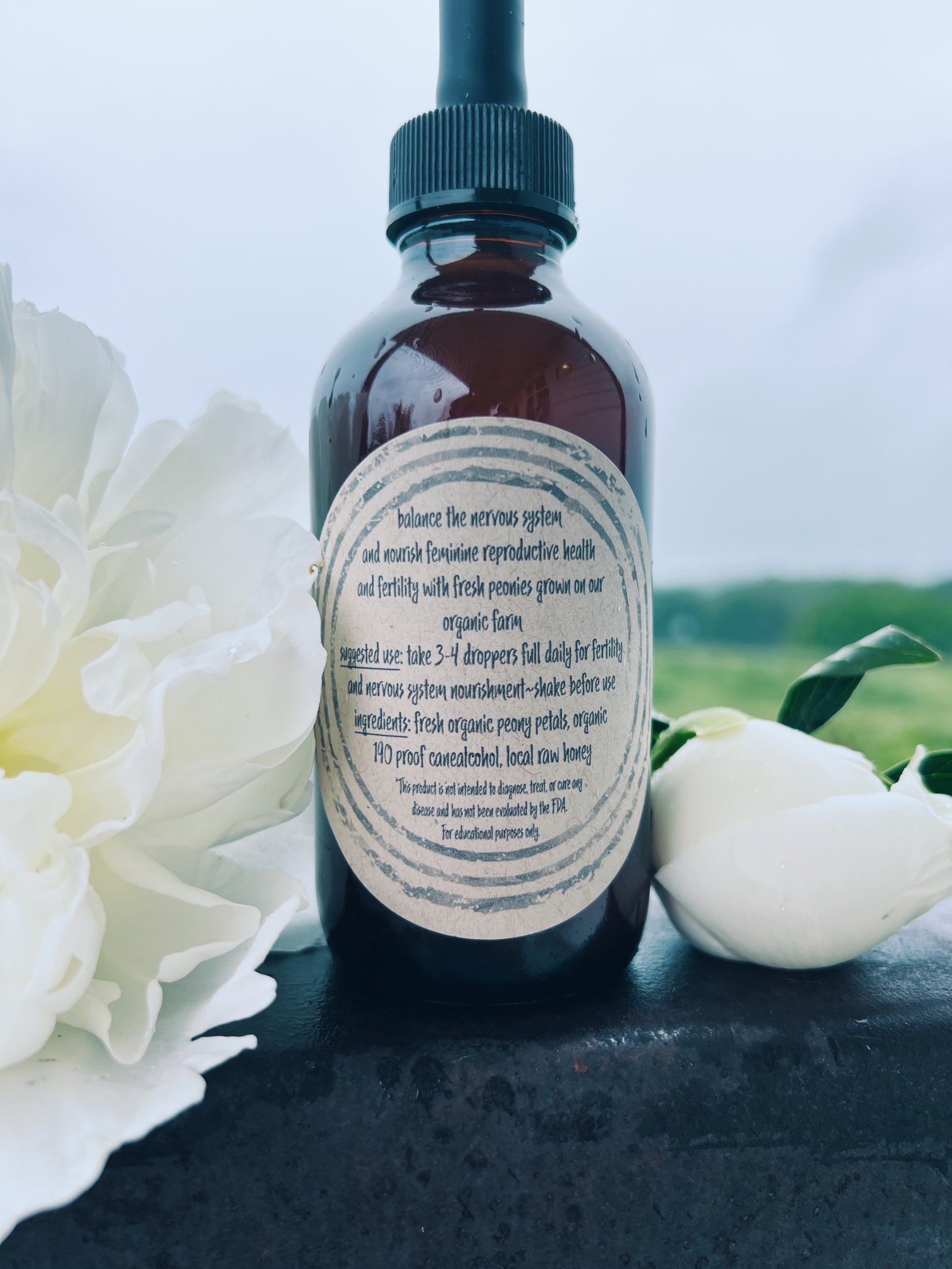 fresh organic peony flowers, organic 190 proof cane alcohol, local raw honey•