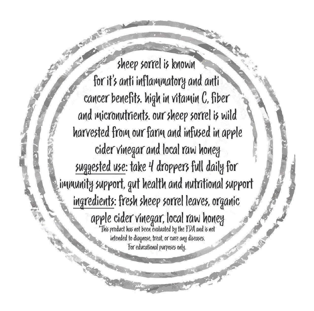 Our sheep sorrel is wild harvested from our organic permaculture farm and infused in organic apple cider vinegar and local raw honey for 4 weeks to create a tangy, sweet and delicious syrup to add to your water, juice salad dressing or favorite recipes•