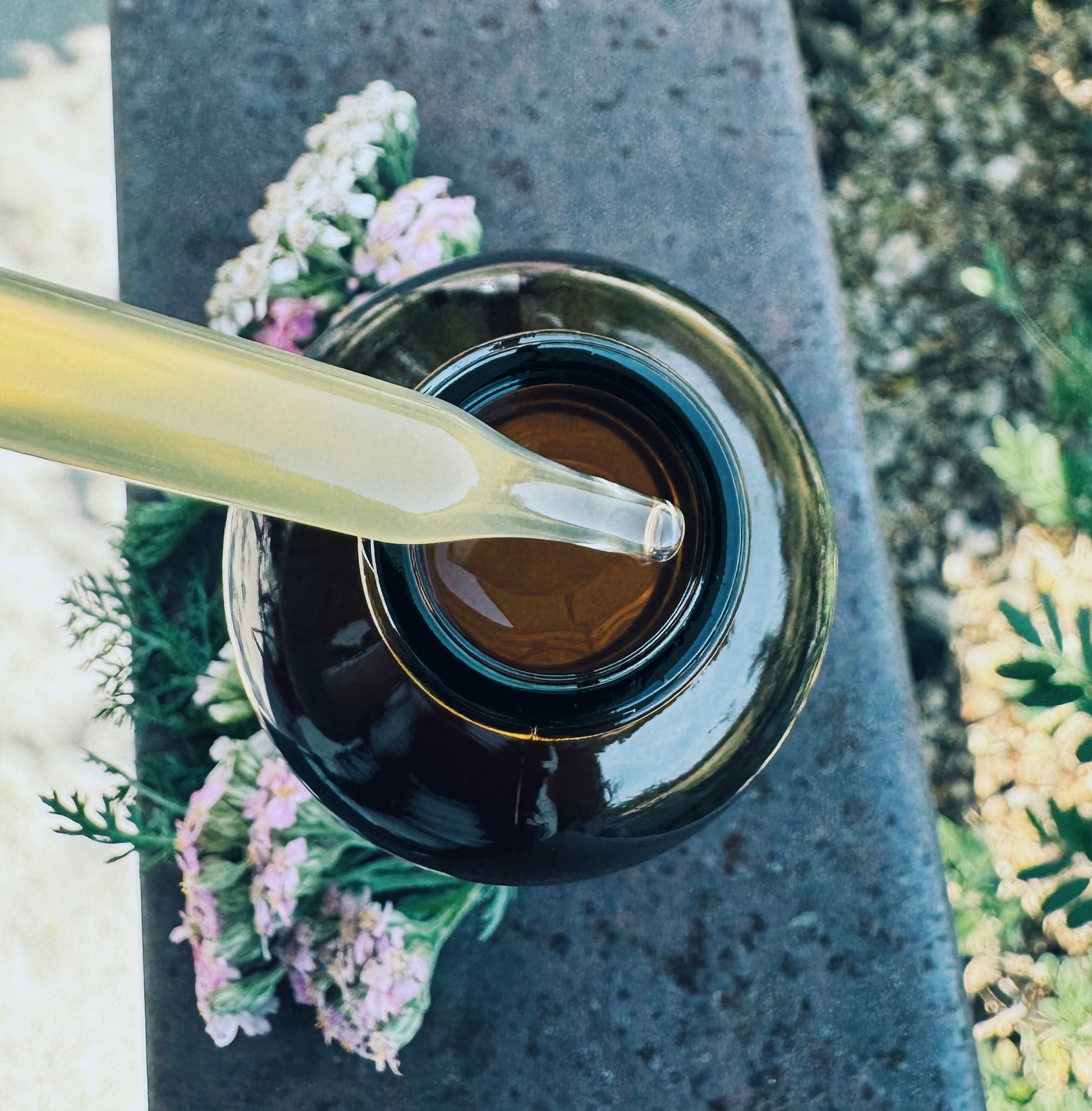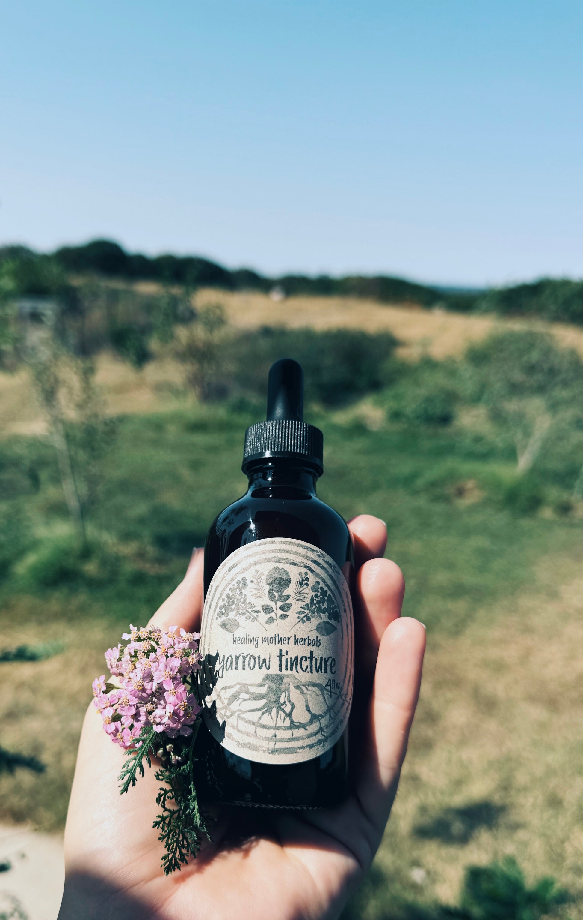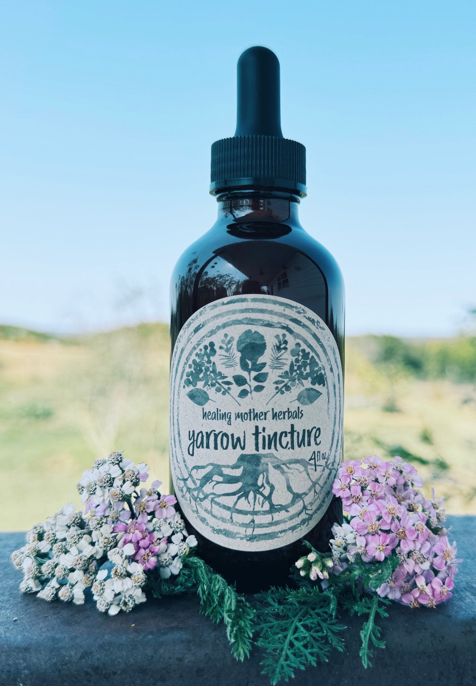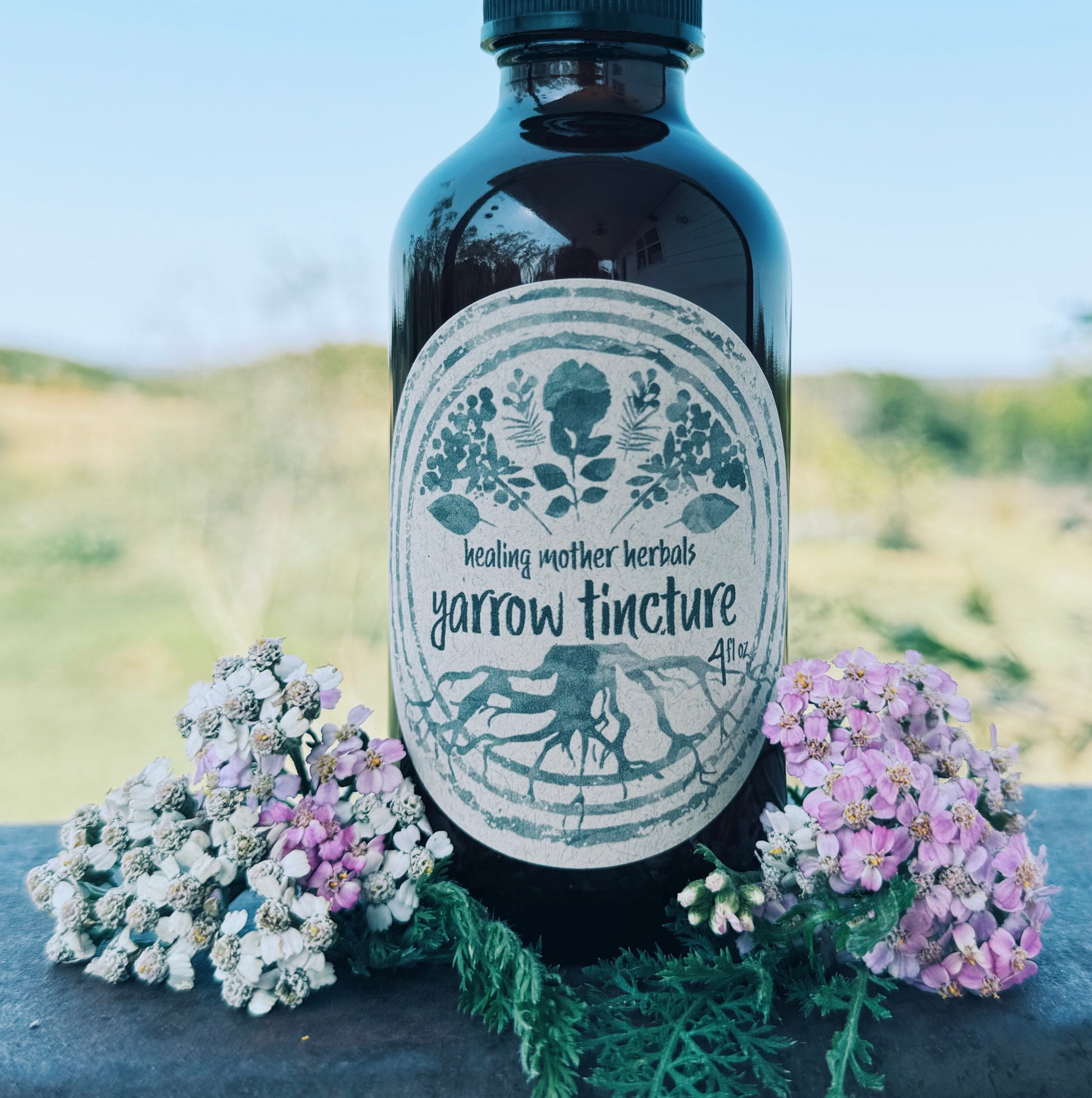 Fresh, organic yarrow flowers and leaves, organic 190 proof cane alcohol and local raw honey•